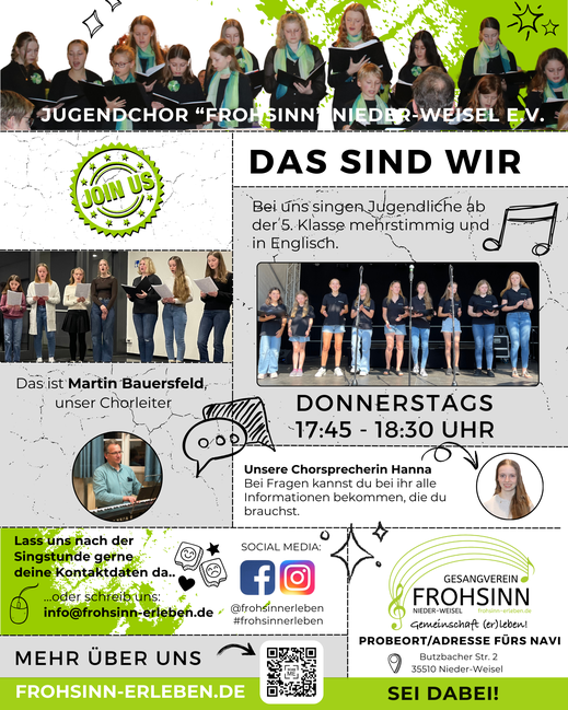 Wir sind ein Chor mitten aus der schönen Wetterau in Hessen. Unser Motto: "Frohsinn erleben - Gemeinschaft erleben!"
