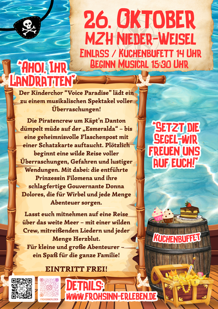 👉 Der Eintritt ist frei – also kommt vorbei, bringt eure Familien und Freunde mit und erlebt, wie unsere jungen Piraten mit Musik und Abenteuer die Bühne erobern.